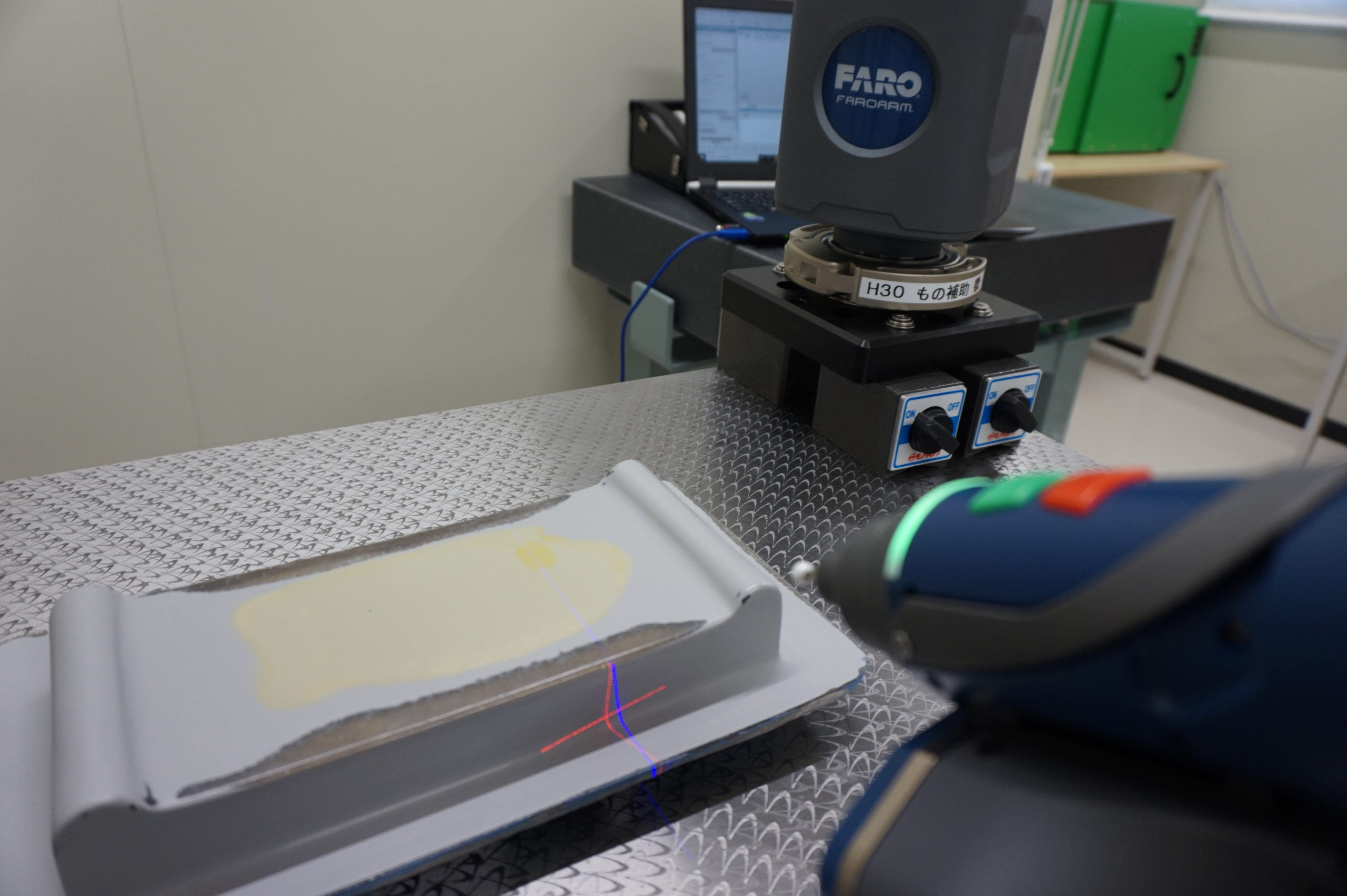 1. 三次元寸法測定機を用い、検査対象物(FRP成形物、木型、ダイカスト製品、鋳型等)の非接触法であるブルーレーザーでスキャニングを行い、ポリゴンデータ(stlデータ)を取得。高精度の2D寸法計測が必要な場合は接触式で計測。