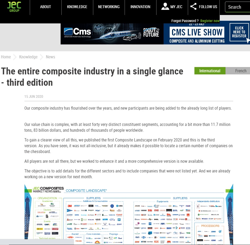 その主催団体であるJEC Groupは、FRP業界における世界中の主役企業をカテゴリー分けして公開するという
