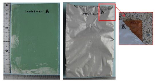 図 FRP耐食塗装試験片の外観写真(左)と認められた外観異常(右)