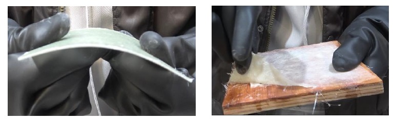 酸性水溶液、並びに塩基性水溶液を予めポリエステル製の不織布に含浸させたうえで、約100mm角に裁断したガラス繊維を1 Ply積層し、そこにマトリックス樹脂であるビニルエステルを含浸させることでFRPを硬化させた。比較のためにこれらの水溶液を含浸させずに、同様の手法でFRPの硬化を行った。その結果、酸性と塩基性、どちらかの水溶液に接触した状態のFRPのみ、硬化不良を起こすことが明らかとなった。正常に硬化したFRPは剛性を有する平板となった一方、硬化不良を起こしたFRPはタック性を有する柔軟なシート状態となった(下図参照)。この原因として、酸性、塩基性の指標となるpHの違いが、硬化現象であるラジカル反応における開始剤の分解反応を抑制した可能性がある。