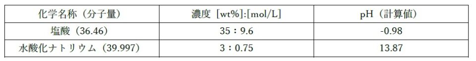 塩酸は濃度35%の水溶液(三和合名会社)をそのまま用い、水酸化ナトリウムは苛性ソーダ99%(三和合名会社)を3wt%に希釈した水溶液を用いた。各溶液の濃度(mol/L)とpHの計算値を下表に示す。溶液のpHは試験紙ロールタイプ(モノタロウ)にて確認した。