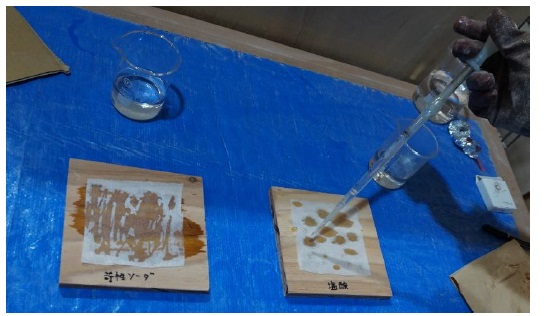 調液した溶液は土台である木材の上に設置された100mm角のポリエステル不織布に、それぞれスポイトで含浸させた。含浸させている様子を下図に示す。