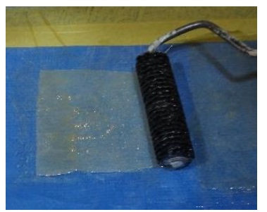 FRPに用いるマトリックス樹脂は、ビニルエステルを主成分とする主剤と過酸化物であるメチルエチルケトンパーオキサイドを含む硬化剤を重量比で100:1となるよう混合して得た。上記で得られた酸性、並びに塩基性水溶液含侵済みのポリエステル不織布に、刷毛と脱泡ローラを用いて硬化剤混合済みのビニルエステルを含浸させた。脱泡ローラで含浸している様子を右図に示す。