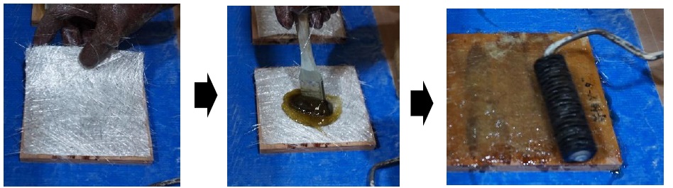 100mm角に裁断したガラス繊維(チョップドストランドマット)を、水溶液を含浸させたポリエステル不織布の上に1 Ply置き、刷毛で硬化剤添加済みのビニルエステル樹脂を予備含浸させた後、脱泡ローラで本含浸させることでFRPの積層を行った。刷毛による予備含浸と、脱泡ローラによる本含浸の様子を下図に示す。