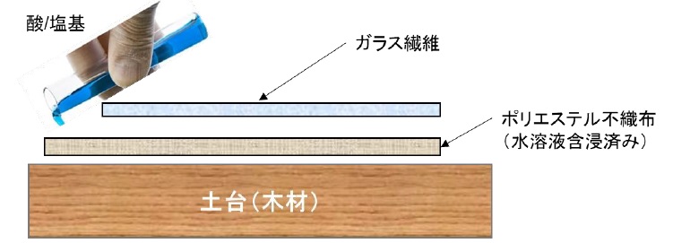 FRP積層構成を模式的に示すと下図のようになる。本積層構成によって、FRPの硬化が酸性、または塩基性の水溶液に接触した状態で行えることがわかる。