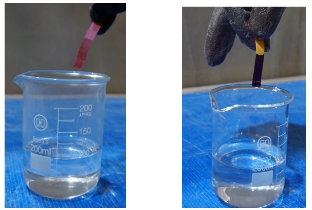 図 pH試験紙の色変化の様子(左:酸性水溶液 右:塩基性水溶液)