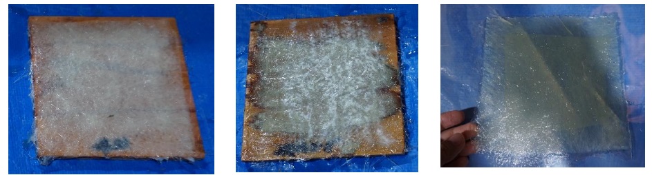 (左:ガラス繊維を不織布の上に置く 中央:ビニルエステル予備含浸 右:本含浸)