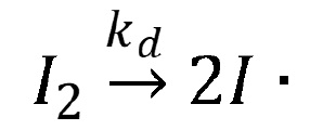この原因として考えられるのは、ラジカルを発生させる開始剤の分解反応速度の低下である。ラジカル反応は開始剤、すなわち今回の反応系だと過酸化物であるメチルエチルケトンパーオキサイドに該当するものをIとすると、下図のように示される。分解反応が抑制されることは、反応速度定数kdが低下することと同等と考えて問題ない。